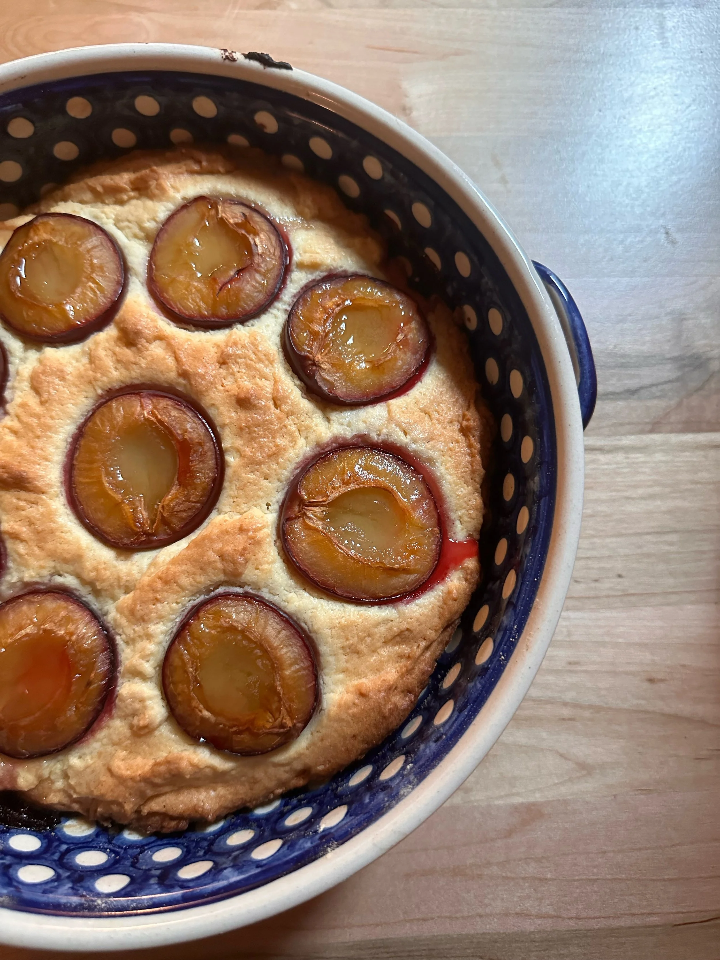 Place the batter into the baking dish. Arrange the pitted plums skin down in whatever fashion your heart desires.