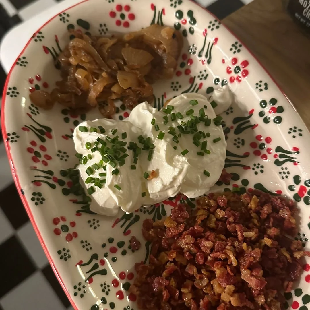 Toppings: Bacon or Pancetta, Sour Cream, Chives
